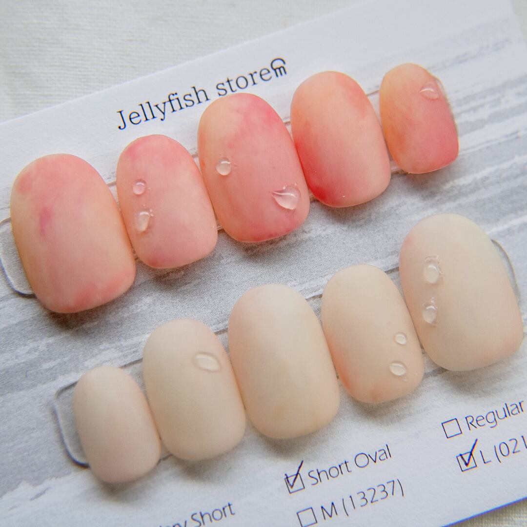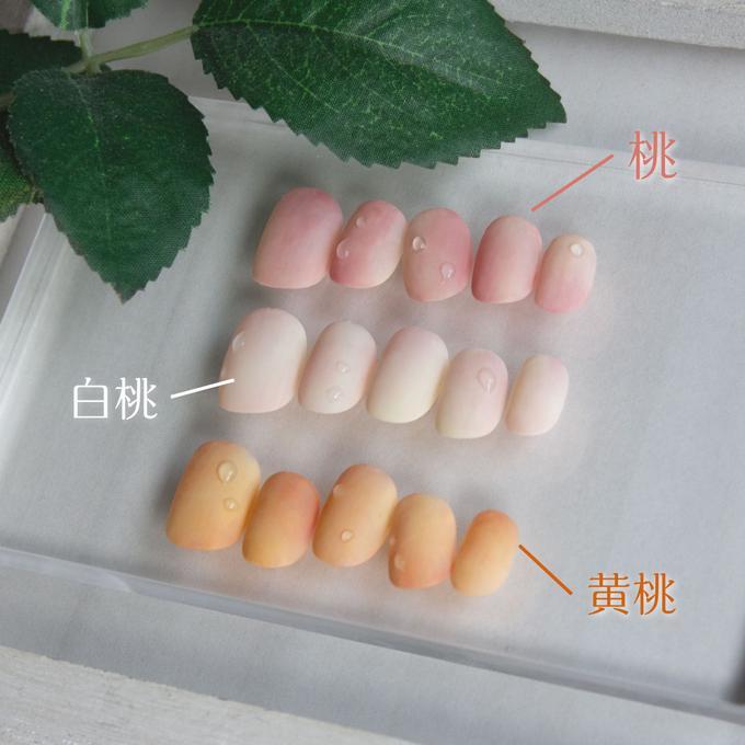 桃 / 白桃をイメージした、ちょっぴり個性派な桃ネイル♪皮の質感を表現するため、マット加工で仕上げました。サイズオーダーでは、桃 / 白桃 / 黄桃の3種類から組み合わせて注文いただけます◎
